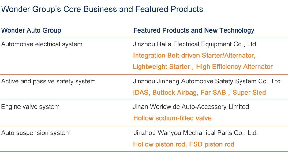 As a professional supplier of auto spare parts system, Wonder Auto Group Limited primarily engages in developing, manufacturing and distribution of four series of auto parts: automotive electrical system, active and passive safety system, auto suspension system and engine valve system. Wonder Group has more than 20 subsidiaries, over 8,000 employees, and a R&D team with over 600 engineers.