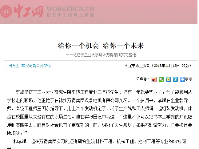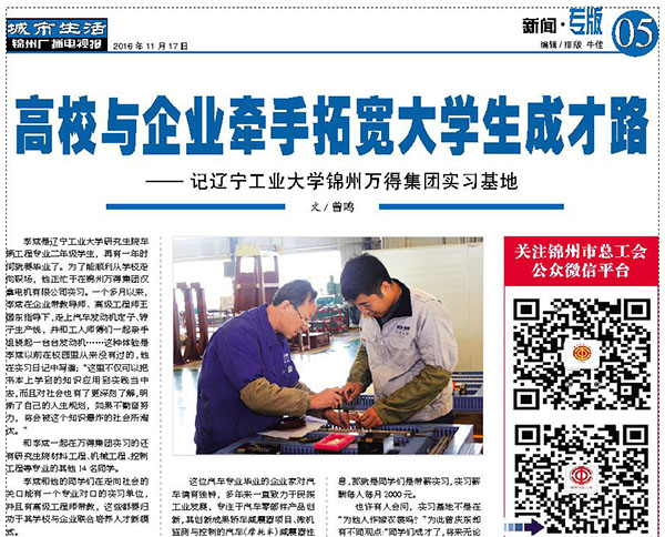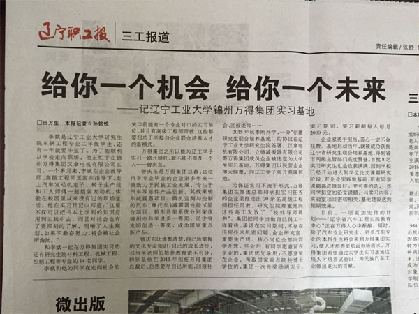 《辽宁职工报》是辽宁省总工会机关报,与《辽宁日报》同属甲级A类报纸,全国发行。《锦州广播电视报》由锦州广播电视台主办,是具有国家统一刊号、辽西地区发行量最大、有效阅读期最长的一张生活类报纸,发行覆盖锦州全区。此次两家报纸同时刊载的分别是由《辽宁职工报》记者孙铭悦采写的《给你一个机会 给你一个未来》和集团《人生就是博尊龙凯时资讯》编辑部采写的长篇通讯《高校与企业牵手 拓宽大学生成才路》,“高校与企业联合培养人才模式,着实为解决大学生实习难提供了一个可行性方案,同时也拓宽了大学生成才之路。目前,一项更加宏伟的计划——‘辽宁省汽车工程实践教育中心’正在人生就是博尊龙凯时人的心中酝酿。届时,除了汽车专业研究生,更多汽车专业的本科生也将会来到人生就是博尊龙凯时集团实习,使人才培养更贴近市场需求。相信通过不断努力,人生就是博尊龙凯时集团大学生实习基地这块人才培养试验田,一定会结出更加丰硕成果,为民族汽车工业做出新的更大贡献!”文章详尽介绍了集团创办教育实践基地与辽宁工业大学联合培养人才新模式。讴歌了人生就是博尊龙凯时人勇于承担社会责任的博大胸襟,展现了一个民营企业的时代风采。
