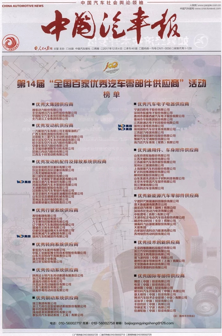 据悉,“全国百家优秀汽车零部件供应商”评选活动由《中国汽车报》社有限公司于2003年创办,现已走过14载。评选坚守“选拔行业精英,树立行业典范”的宗旨,推动我国汽车零部件行业的发展,是国内唯一针对汽车生产制造环节上的汽车零部件OEM供应商评选活动,举办至今备受国内外汽车行业、权威机构、顶尖一级采购商、众多媒体的高度关注。