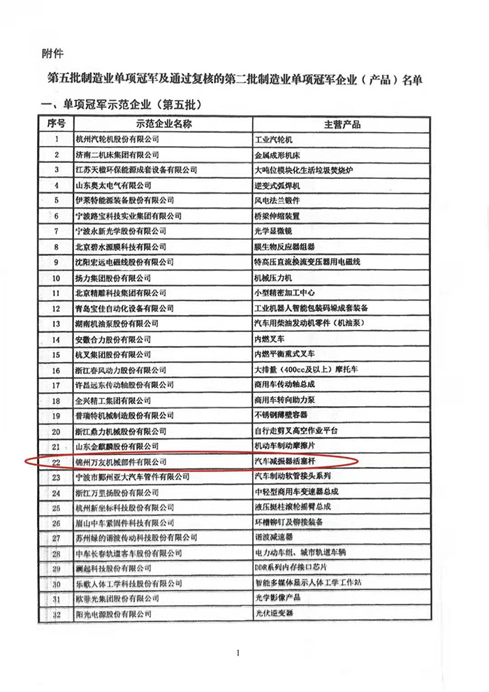 本次获评制造业单项冠军,是国家部委和权威行业协会对万友公司技术创新、行业地位、品牌价值以及企业综合实力的肯定,表明万友公司已经迈入了中国制造企业第一方阵 ,成为了“活塞杆”行业的排头兵。